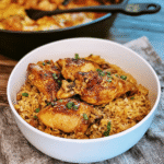 Indulge in this comforting chicken and rice dish, featuring tender chicken thighs and fluffy rice, all cooked in savory spices for a delightful family meal.