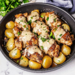 Savor the delightful combination of tender chicken and golden roasted potatoes, infused with aromatic garlic and rich parmesan cheese for a comforting family meal.