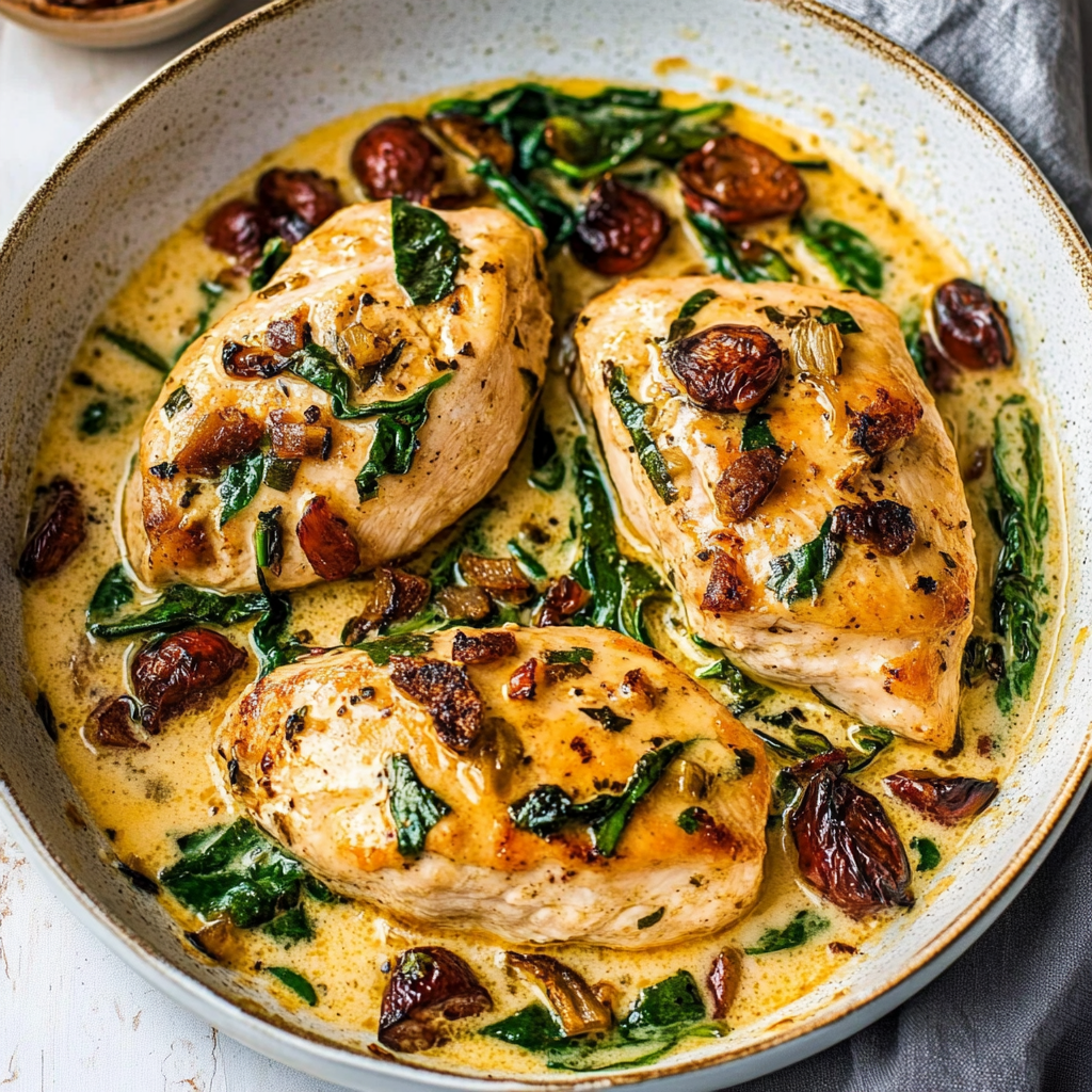 Indulge in the rich flavors of creamy Tuscan chicken, featuring tender chicken breasts in a velvety sauce with sun-dried tomatoes and fresh spinach—perfect for any occasion.