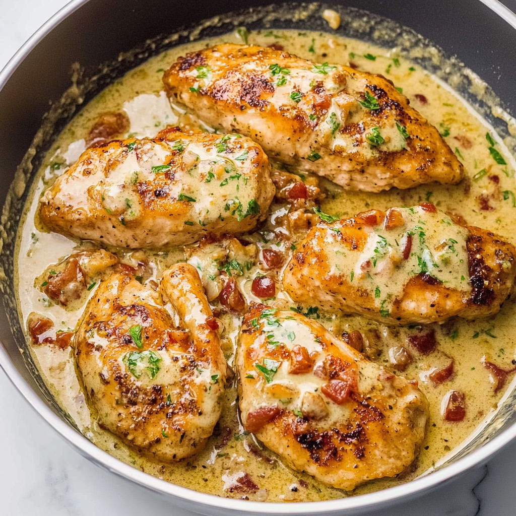 Indulge in tender chicken breasts enveloped in a luscious creamy sauce infused with sun-dried tomatoes and garlic, perfect for impressing loved ones at dinner.